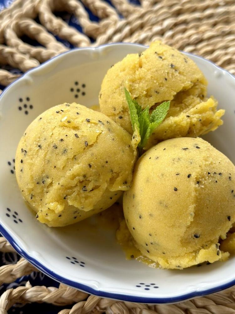 Protože nemám zmrzlinovač, směs dávám do tvořítek na led. Jakmile jednotlivé kostičky zmrznou, dám opět do mixéru a promixuju do konzistence sorbetu. Tady záleží na výkonnosti vašeho mixéru, pokud máte méně výkonný nebo pouze tyčový, stačí nechat zmrzlé kostky trochu povolit a promixovaný sorbet dát ještě na chvíli do mrazáku, pokud je povolený příliš.